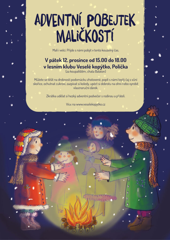 Adventní pobejtek se koná12. prosince od 15.00 do 18:00 hodin. Čekají na vás rukodělné dílničky, muzicírování a dobroty nejen u ohně.