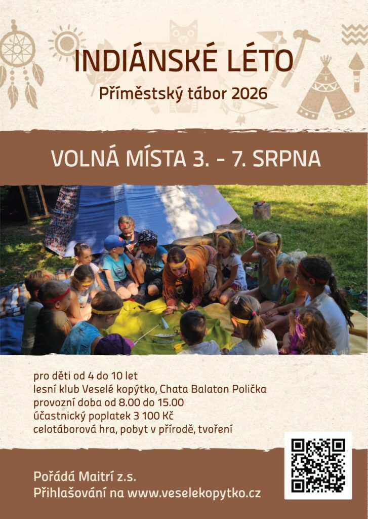 Uspořádání tábora probíhá v rytmu našeho lesního klubu a odehrává se venku za každého počasí. Provozní doba je od 8.00 do 15:00. Týdenní program je protkán tematickou hrou věnovanou moudrosti indiánů. Podrobné informace k příměstskému táboru budou zaslány minimálně dva týdny před zahájením na vámi uvedenou e-mailovou adresu.
